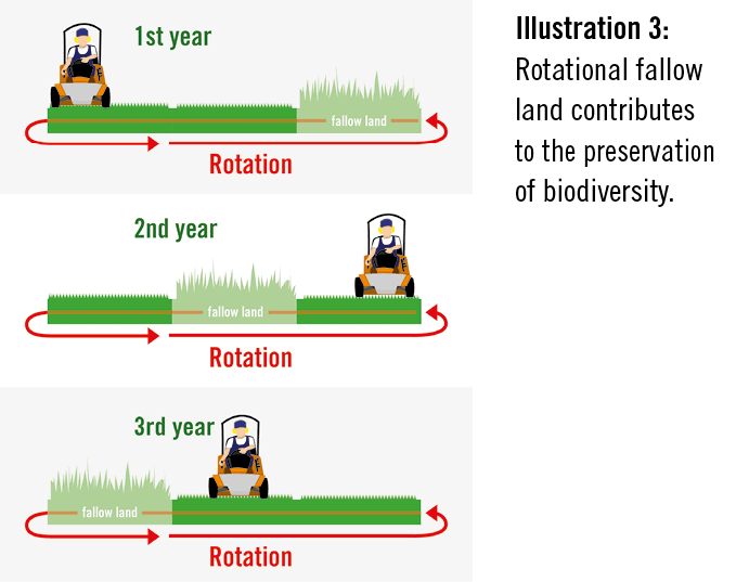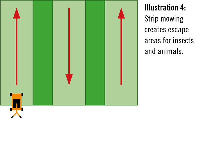 - Διατήρηση μη κομμένων περιοχών ως περιοχές διαφυγής (παλιές λωρίδες χόρτου). Εδώ οι υποπληθυσμοί μπορούν να αναπτυχθούν ανενόχλητοι και στη συνέχεια να επανασταθούν στις κομμένες περιοχές