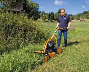 Equipped with a cross-blade system the AS 62 4T B&S reliably cuts growth ranging from 50-100 mm high. Cutting height is adjusted for each axle, variable to five levels in the front and rear. The operator can also select a drive speed between 1.9 and 4 km/h. The two freewheel units in wheel drive and the moving front wheels enable comfortable steering, turning and maneuvering around obstacles, even while driving. A conically tapered mowing deck ensures a uniform material flow.
