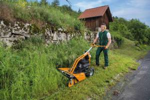 Mulch where others hit their limits. The AS 63 2T ES is equipped with the world’s only 2-stroke engine that meets the requirements stipulated by the EU Emissions Directive 97/68/EC. The AS 2-stroke engine maintains engine lubrication regardless of position, enabling mowing on inclines of 40 degrees and more without the risk of engine damage. In addition, the AS 2-stroke engine is factory-equipped with an EasyStart function; the CDI digital ignition system cuts the rpms required to start in half. The 2-stroke engine’s high torque provides full power in high, wet grass while a third crankshaft bearing and friction discs on the wing blade protect the engine in the event of striking an obstacle. Large inflatable tyres with field studs offer ideal propulsion at speeds up to 4.0 km/h.