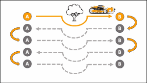 Several automatic programmes are available for the mowing pattern of a bypassed area. Larger turning radii protect the ground. The turning manoeuvre is performed automatically. The user monitors the mowing process.