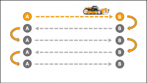 Points A and B are saved. The entire area is divided into parallel lines and mowed seamlessly. Turning is done manually. It does not matter which line is approached next. The mowing pattern is variable in design.