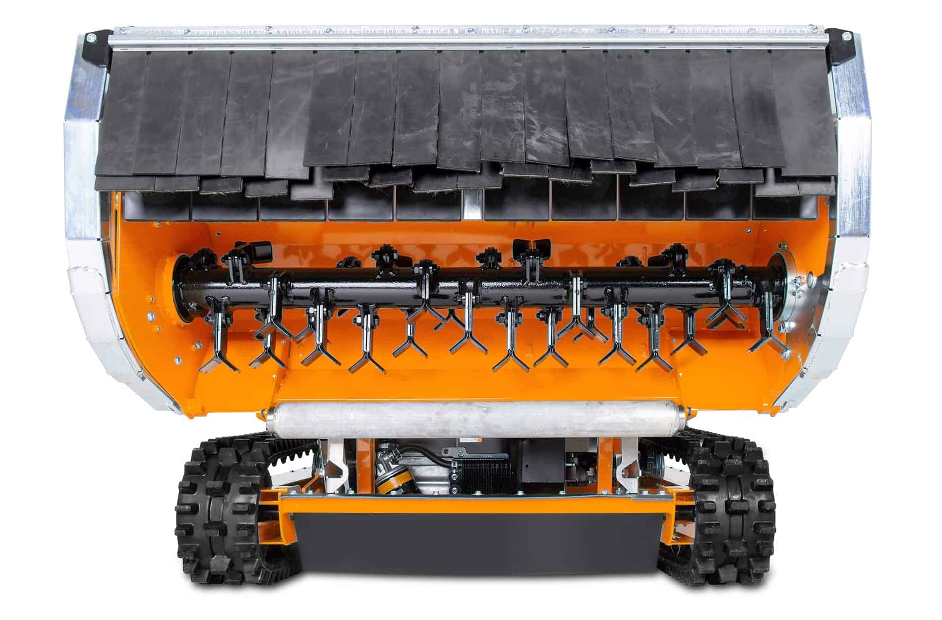 Stable caterpillar tracks with steel inserts provide maximum traction on steep slopes. The assembly of the belts is quickly done thanks to the integrated quick tensioning system and defined adjustment for exact track tension. An automatic, mechanical parking brake brings additional safety when working on slopes. With its compact dimensions of 184 cm / 115 cm / 69 cm (only 159 cm long with the mower deck raised), the remote-controlled flail mower can be transported easily and quickly.