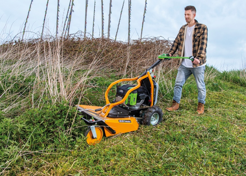 The AS 63 is the slope mower par excellence. With its pneumatic tires and differential lock, it climbs slopes with ease. The engine brake allows it to maintain the selected speed downhill without speeding up. Equipped with a cross-blade system, the AS 63 E-Allmäher easily cuts and shreds tall grass with light brush up to 100 cm high.