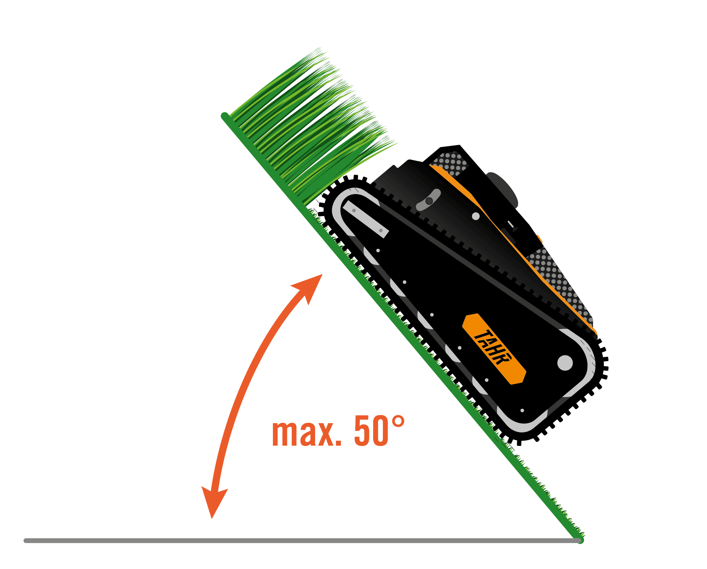 With a slope rating of up to 56°, the Tahr RC easily outperforms conventional ride-on mowers. The crawler tracks provide strong traction, stability, and low ground pressure of just 0.13 kg/cm², ideal for embankments, dykes, or water edges.